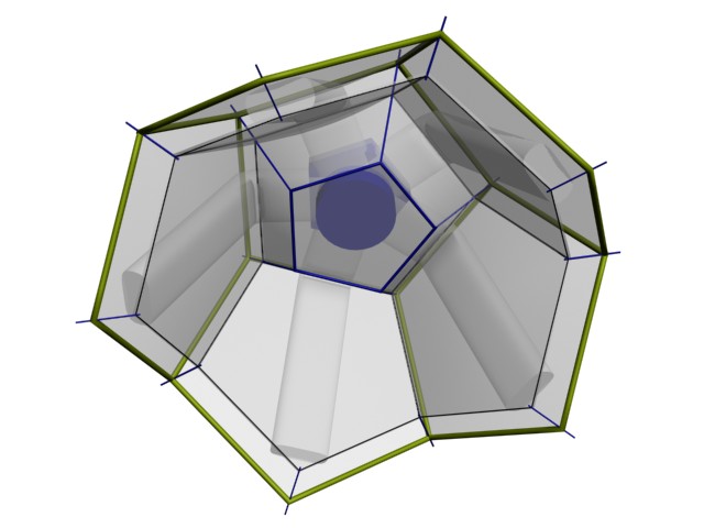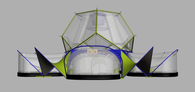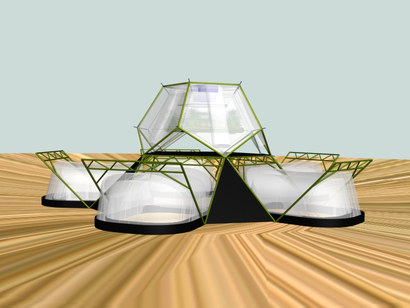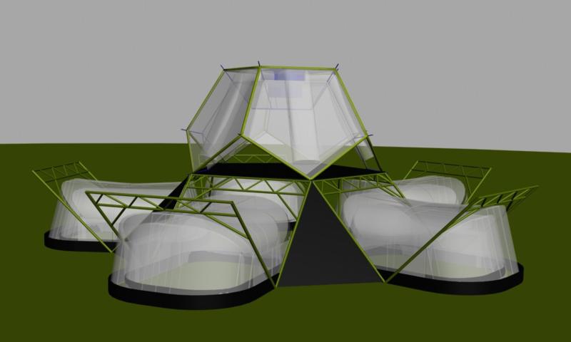 << Future Build Home ![]() On half of a Dodecahedron forming the central roof hub. Outer frame: aluminium tubing; inner skin steel cable tensile structure. ![]() Hub roof seen from above with bubble generator (blue) and bubble flow ducts. ![]() Hub roof seen from beneath. Bubbles are carried down ducting to the bottom of each cavity where they begin outward expansion. last air gap is the bubble generator cradle/ return manifold, seen at the top of the hub. Petal modules and hub assembly. ![]() ![]() Ventilated desert cool house ![]() |