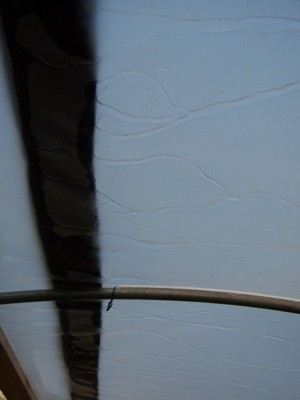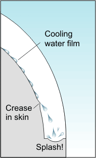 In one segment of the cavity an undesirable splashing was created but the liquid film being projected off the surface of the inner skin by a crease, and splashing into the trough. The trough was created when the skin is folded in the factory. This minor problem should be overcome by retensioning the inner skin at the offending section or maybe sticking stiff plastic length inside along crease to pull flat.