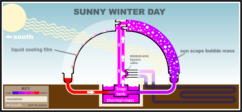 When solar energy is available, a continuous film of surfactant solution is run inside the south cavity over the inner skin. This surfactant solution film is pumped from and returned by gravity to a insulated tank buried beneath the structure. In this phase of operation the surfactant properties of the solution is not being utilised as the liquid is simply acting as a vehicle for collecting and transporting low-grade solar energy from the south cavity to the liquid thermal mass.
