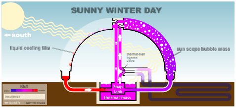 During the day the south facing cavity is emptied of bubbles, by a process described in the chapter on the bubble regeneration cycle. In this state, even before any solar energy collection system is utilised, the SolarBubbleBuild has a solar advantages over the conventional greenhouse. The bubbles maintained in the north cavity not only insulate the interior environment from heat loss from that side of the structure, but also act as a ‘sun scope’ reflecting IR energy back into the environment from the sun in the south.