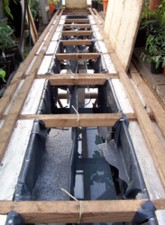 In this project the out-coming soap solution film is returned to a plastic bladder, which is in turn located within a large insulated tank beneath the structure. This tank contains about 1300 litres of plane water. As the bladder skin is thin the thermal gain collected in the soap tank during collection mode, quickly transfers to the larger surrounding volume of water. We call this water our warm thermal mass. Due to the very high thermal capacity of water, we can store large amounts of thermal energy in this thermal mass to be drawn on at night when it is required to warm the interior space.