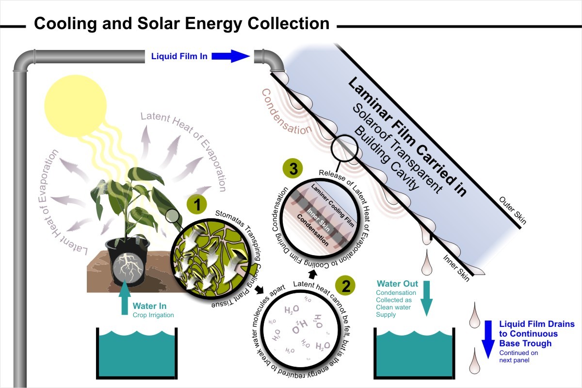 The key mechanism in both the cooling and solar energy collection modes start with the utilisation of living plants as an integral component of the working blue/green system. Living plants have an amazing capacity to convert heat energy into what is called the ‘latent heat of evaporation’. Before this process is examined more closely, however, a quick glance at plant biology might prove beneficial.